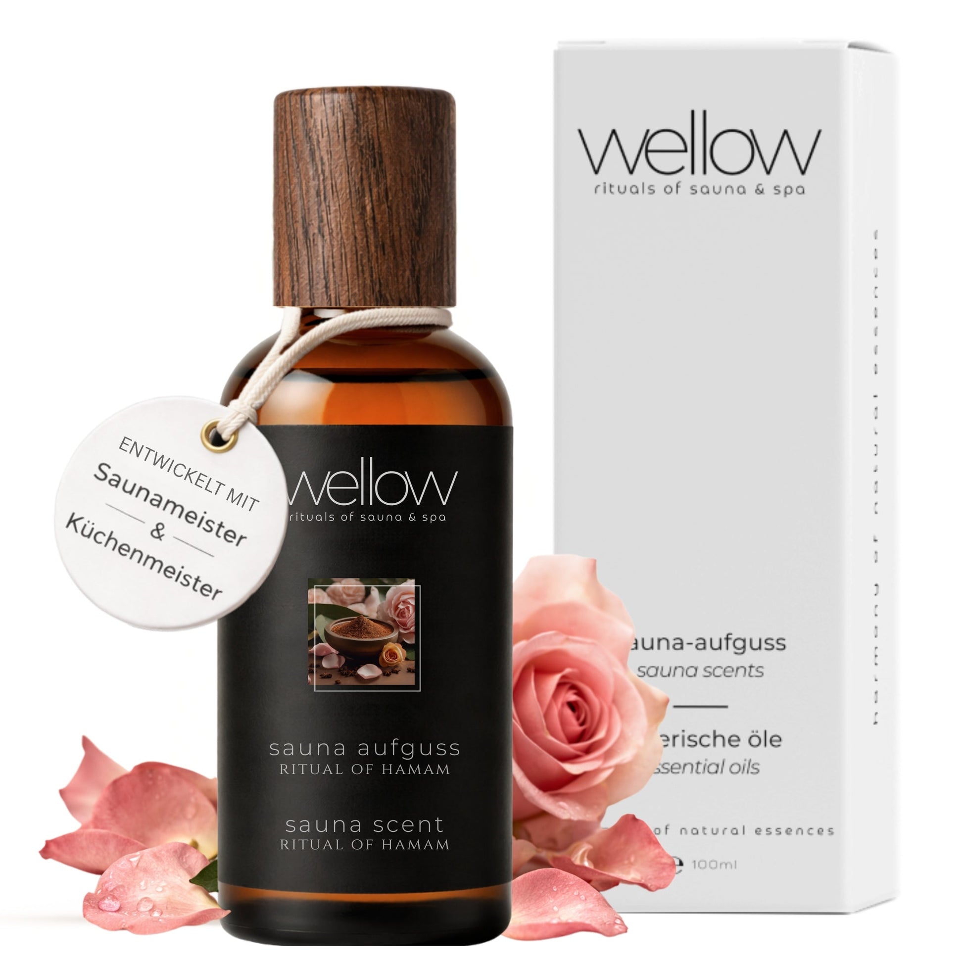 Mit hochwertigen Details wie der edlen Flasche, einem Bambusdeckel, der die Verbindung zu traditionellen Holzsaunen symbolisiert und einer stilvollen Kartonverpackung schaffen wir eine besondere Ästhetik, die das Saunaaufguss-Erlebnis komplettiert.